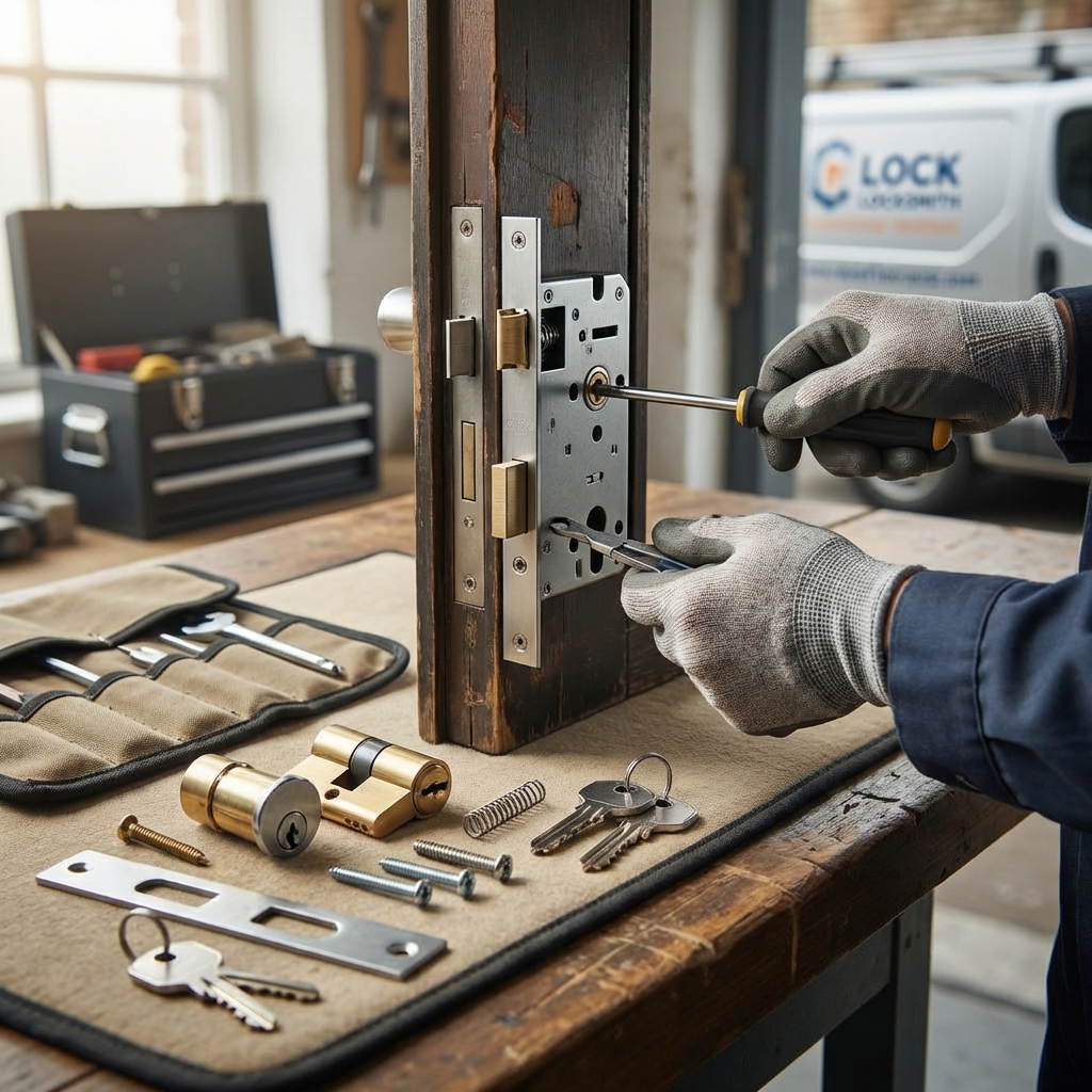 Remplacement professionnel d'une serrure par un système multi-points haute sécurité. Installation précise avec cylindre A2P certifié.