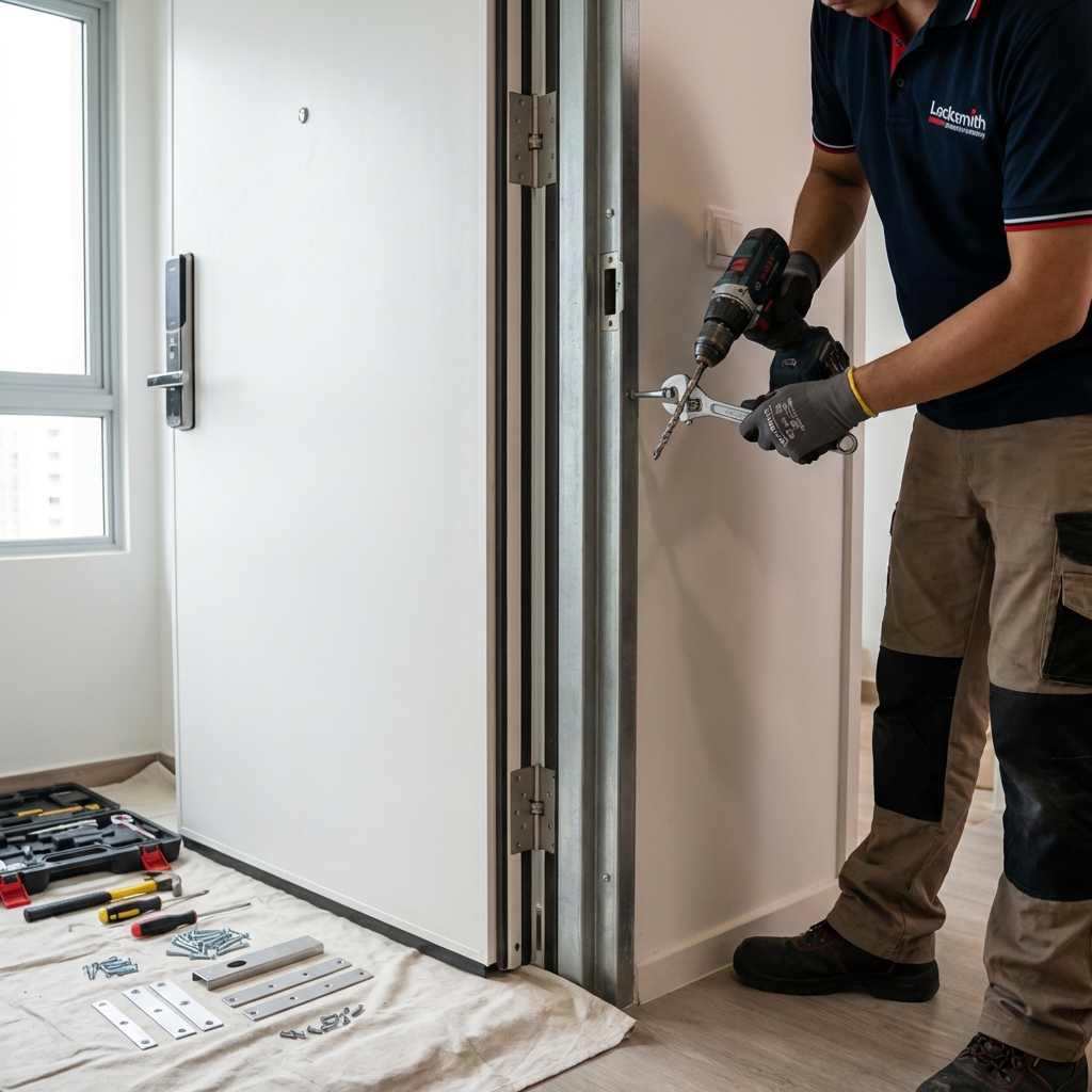Installation professionnelle d'une porte blindée certifiée A2P. Travail soigné avec renforcement du bâti et système de sécurité multi-points.